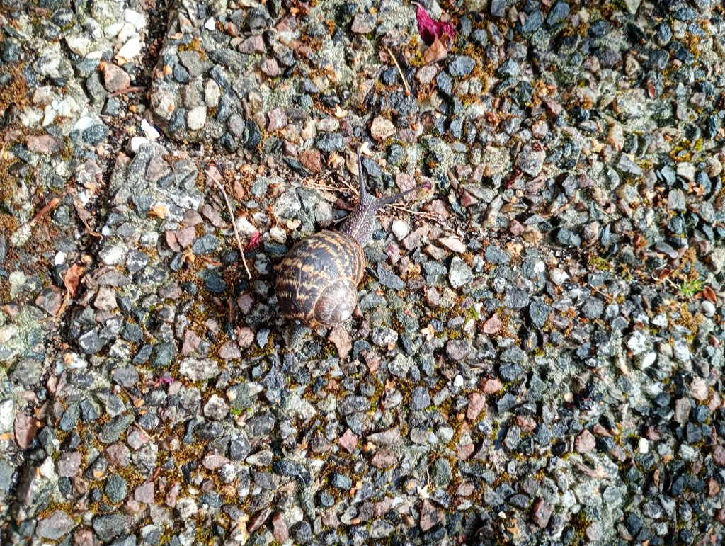 I slutet av maj i fjol invaderade en för oss ny snäcka vår trädgård. Glupsk sak som åt upp bland annat en halv rabatt tagetes. Mannen räknade till ett sjuttiotal när han gick med ficklampa på kvällen. Den försvann sedan, men visade sig igen sista dagarna i juli. Den är omkring tre centimeter i ”huset”, mörkt brun med ljusare mönster. Vi har erfarenhet av vinbergssnäckor, så vi vet att det inte är något sådant. Är det en nykomling i vår Herres hage?