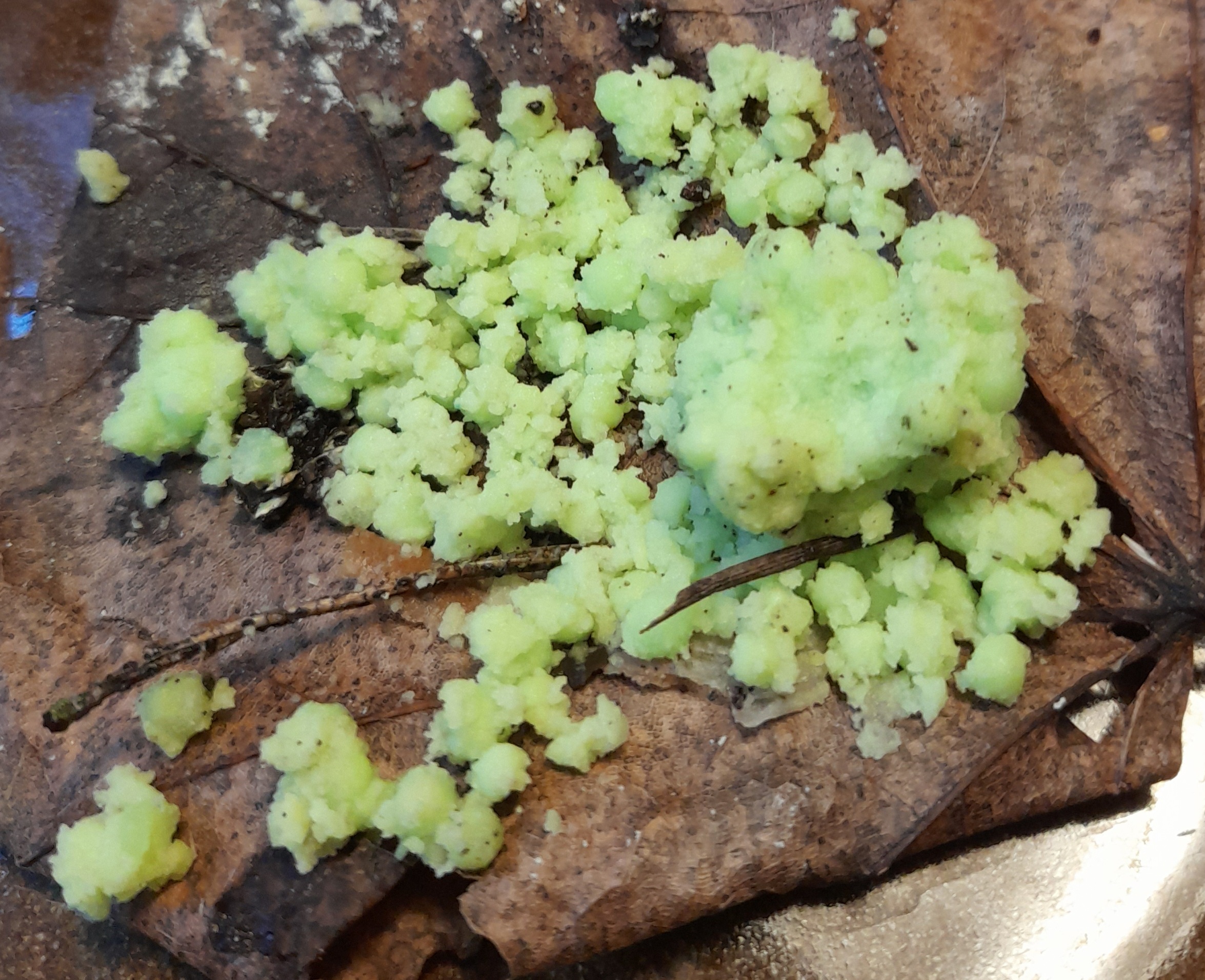 Jag har hittat två klumpar med kulor i trädgården. De är limegröna, porösa, och luktfria. De låg på en bädd av lönnlöv bland lönn, tall och andra lövträd. Vissa kulor är porösa, andra fasta. Jag tänker spontant på (snigel?)ägg, svamp eller svamp som angripit ägg. Sista bilden är en delad kula med fast konsistens. Vad är det för något?