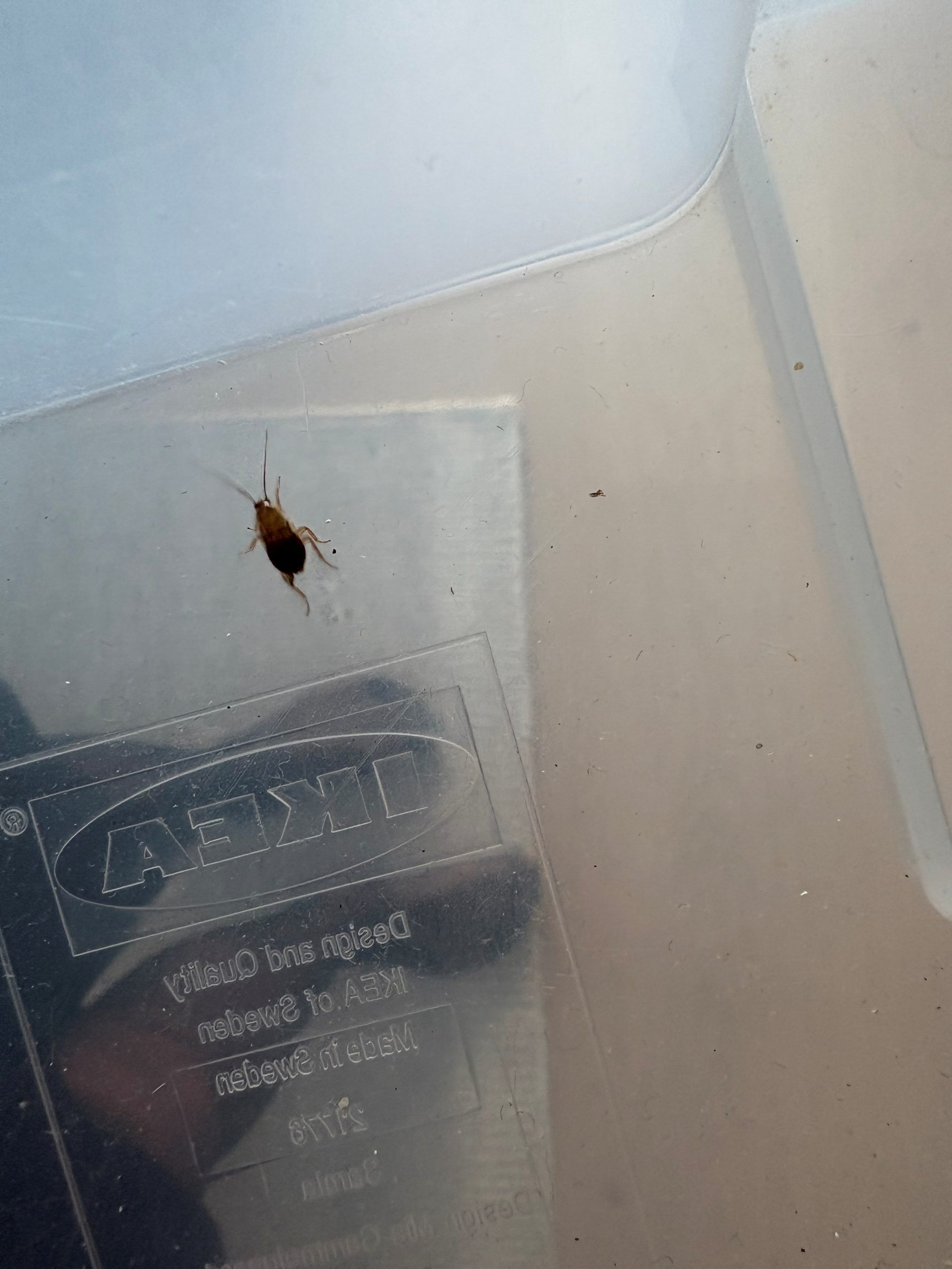 Jag hittade detta djur i en plastlåda som stod uppe på ett högt skåp i vår tvättstuga. Enligt internet är det en kackerlacka. Tyvärr är bilden dålig, men går det att avgöra om vi bör kontakta en skadedjursbekämpare? Vi bor granne med skogen. Min man reser över hela världen i sitt jobb. Vi bor i ett nybyggt hus och har det i övrigt rent omkring oss.