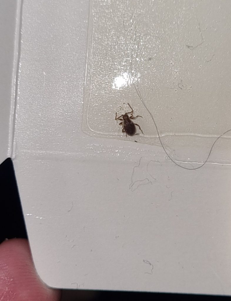 Jag får inget bra svar när jag bildsöker, så jag vänder mig till experterna. Vad kan det vara som har fastnat i min klisterfälla för silverfiskar? Det sitter 2 okända insekter på den, omkring 5 millimeter långa. Fällan ligger vid listen under TV-bänken.