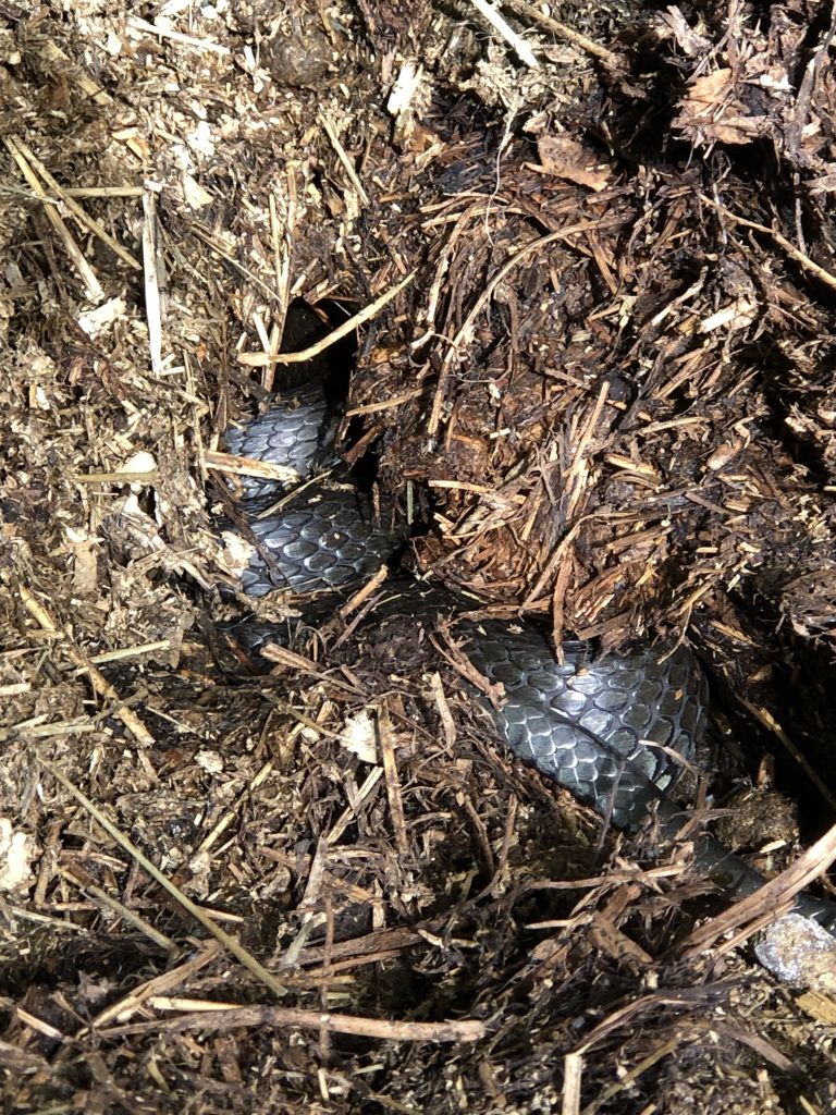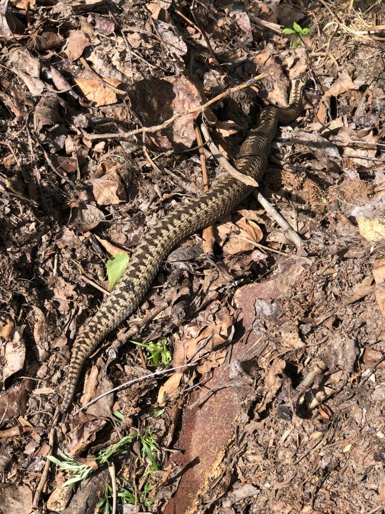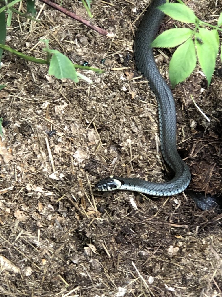 En svart huggorm låg igår bredvid de 4 snokarna, men den solade. Just den ormen har hela tomten som sitt revir sedan två år och har samma livsmönster dagligen och den är så van vid mig att den inte någonsin går undan. Igår och idag har det även varit en brun huggormshona här så förhoppningsvis blir de fler. Tomten har alltid haft orm och paddor, grodor och ödlor.