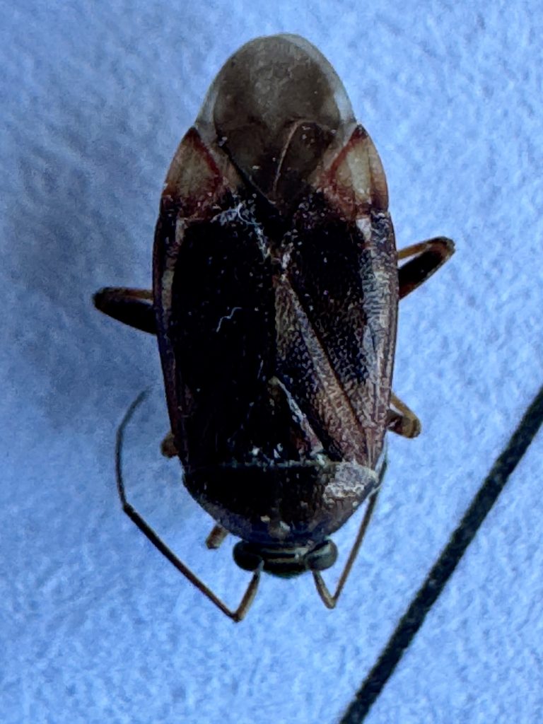Så vad är det då, undrar du nu. Jo, det är en ängsskinnbagge (avlägsen släkting till bärfisar) i ett släkte som heter Lygus på vetenskap, men saknar svenskt namn. Trots att vi bara har 6 olika Lygus-arter i Sverige kan de knappast bestämmas från bilder. Man måste studera behåringen och inre morfologi i mikroskop för att vara säker. Med det sagt, brukar Lygus wagneri kunna se ut ungefär såhär. Det här är aldrig några skadedjur. De lever på många olika slags växter där de dels suger växtsaft, dels äter en del små och mjuka insekter. Nässlor är en populär värdväxt. Lygus-skinnbaggarna övervintrar som vuxna djur i lövförna och på liknande platser, och vaknar till så snart det kommer lite vårvärme. Det här djuret har sannolikt vaknat ur sin vintervila, börjat flyga runt för att hitta en plats att reproducera sig på men hamnat inomhus av misstag och där dött av uttorkning.