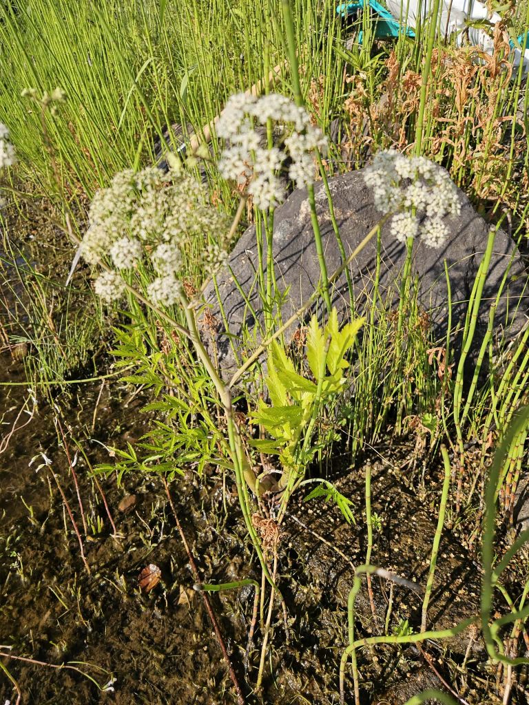 Sprängört, Cicuta virosa, är mycket giftig och dödsfall har inträffat när den kraftiga roten förväxlats med ätliga rotknölar. Men sprängörten är inte farlig om man inte äter av den. Det finns alltså ingen anledning till oro, inte ens när sprängört växer på en badplats. Bilden skickades in av Catrin.