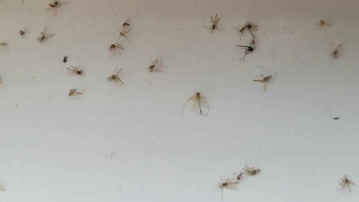 Vad är det för kvälls- och nattaktiva insekter som kommer in i tusental nu på sensommaren? De söker upp ljus, till exempel en ljus vägg bakom en lampa eller en fönsterbräda där utebelysningen lyser in. Och varför söker de upp ljus när de är nattaktiva? Hur ser deras livscykel ut – de verkar ju leva ett kort liv? Insekterna är 3 millimeter långa och bilden är tagen i Mönsterås kommun, i augusti 2022.