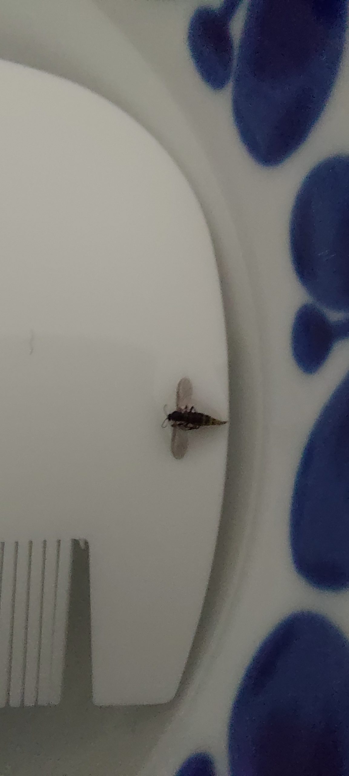 Det är litet svårt att se på bilden, men det rör sig om någon slags icke-stickande mygga. Mest tycker jag att det ser ut som en sorgmygga (myggfamiljen Sciaridae). Till dessa hör bland annat flygfäna i blomkrukor som vi i dagligt tal kallar ”blomflugor”. Riktiga blomflugor är någonting helt annat!