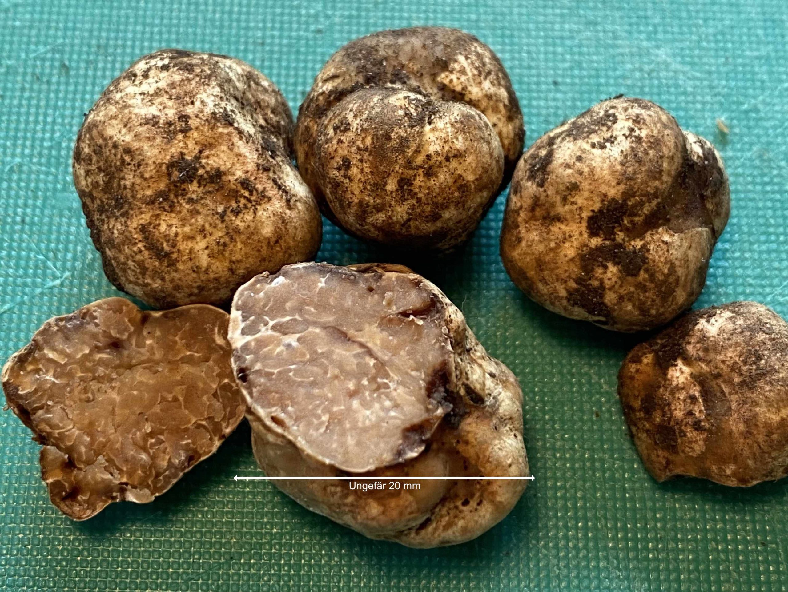 Tyvärr finns det inga kulinariska Tuber-arter i Jämtland och dina exemplar är inte ätbara, men det är ändå mycket intressant att ta reda på vilken art det är. Om du har kvar något exemplar så är svampexperten Ellen Larsson på Göteborgs universitet mycket intresserad av att sekvensera och artbestämma dem. Hör av dig till redaktionen för Fråga en Biolog för att få hjälp med adressuppgifter och information om hur du skall skicka svamparna.