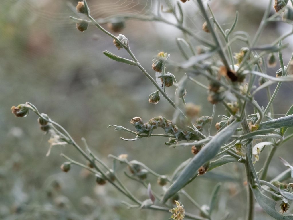 I somras hittade jag den här fjärilslarven vid kusten öster om Karlshamn i Blekinge. Den satt på en malörtsplanta. Vad kan det vara för larv? Ett malörtskapuschongfly, kanske?