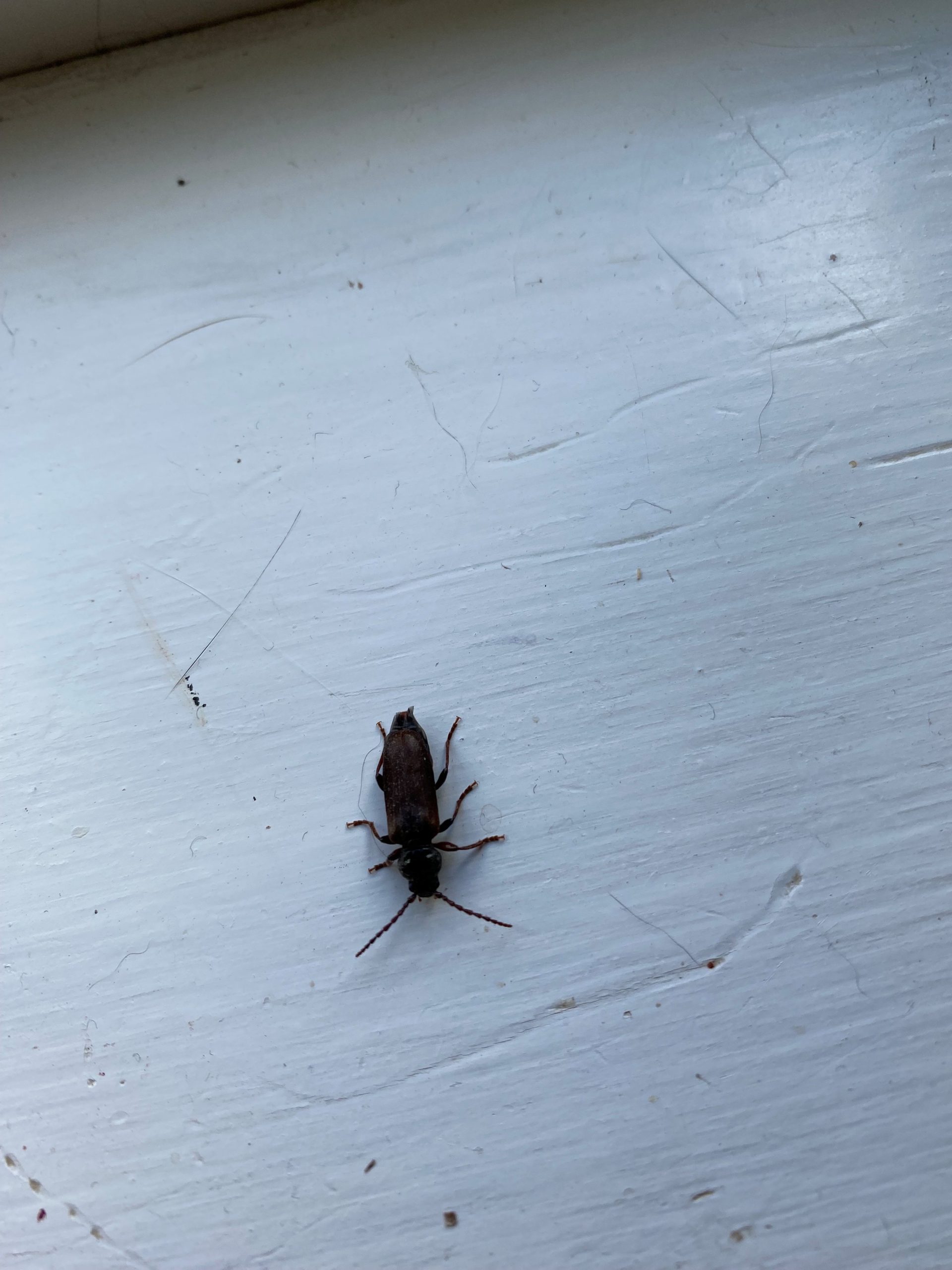 Det är antigen allmän barkbock (Tetropium castaneum) eller skulderfläcksbock (Tetropium fuscum). Båda skalbaggarna hör till familjen långhorningar, med omkring 130 arter i landet. Skulderfläcksbock har ett ljust parti på skuldrorna, och det tycker jag mig kunna se på din bild, men med ett litet frågetecken eftersom det ljusa området också kan vara en optisk illusion. De båda arterna skiljer sig också åt på halsskölden, där allmänna barkbocken har en glansig halssköld medan skulderfläcksbocken har en matt, punkterad, dito.